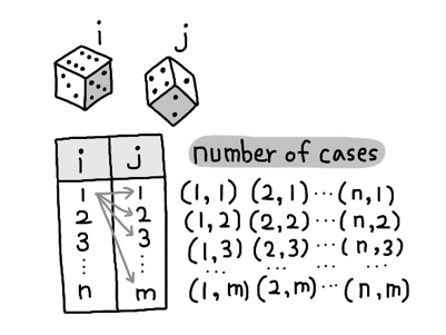 서로 다른 주사위 2개를 던졌을 때 나올 수 있는 모든 경우를 출력해보자.