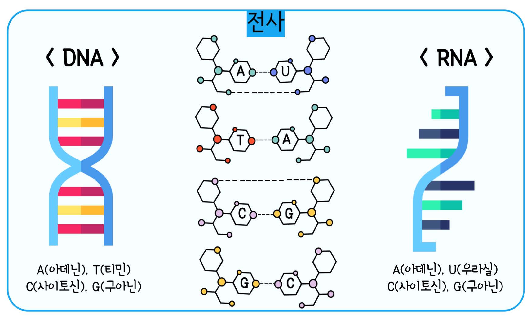 DNA는 4가지 염기 아데닌(A), 티민(T), 사이토신(C), 구아닌(G)으로 구성되고, RNA는 4가지 염기인 아데닌(A), 우라실(U), 사이토신(C), 구아닌(G)으로 구성된다.