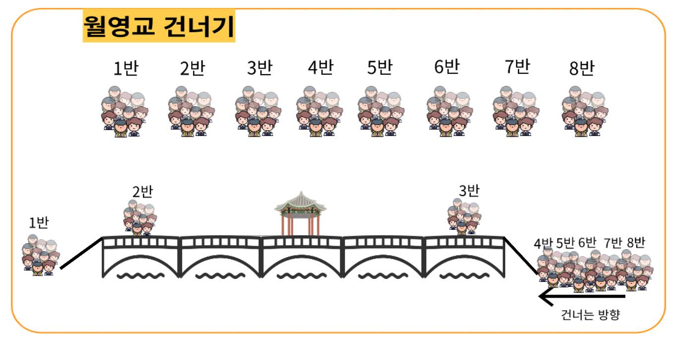 수학여행으로 월영교를 찾은 학생들이 학급 순서대로 가능한 한 빨리 다리를 건너가려고 한다. 학교에서는 학생관리와 안전지도를 위해 다리 위에서는 학급 단위로 이동하고, 다리를 건너는 인원을 관리하기로 했다.