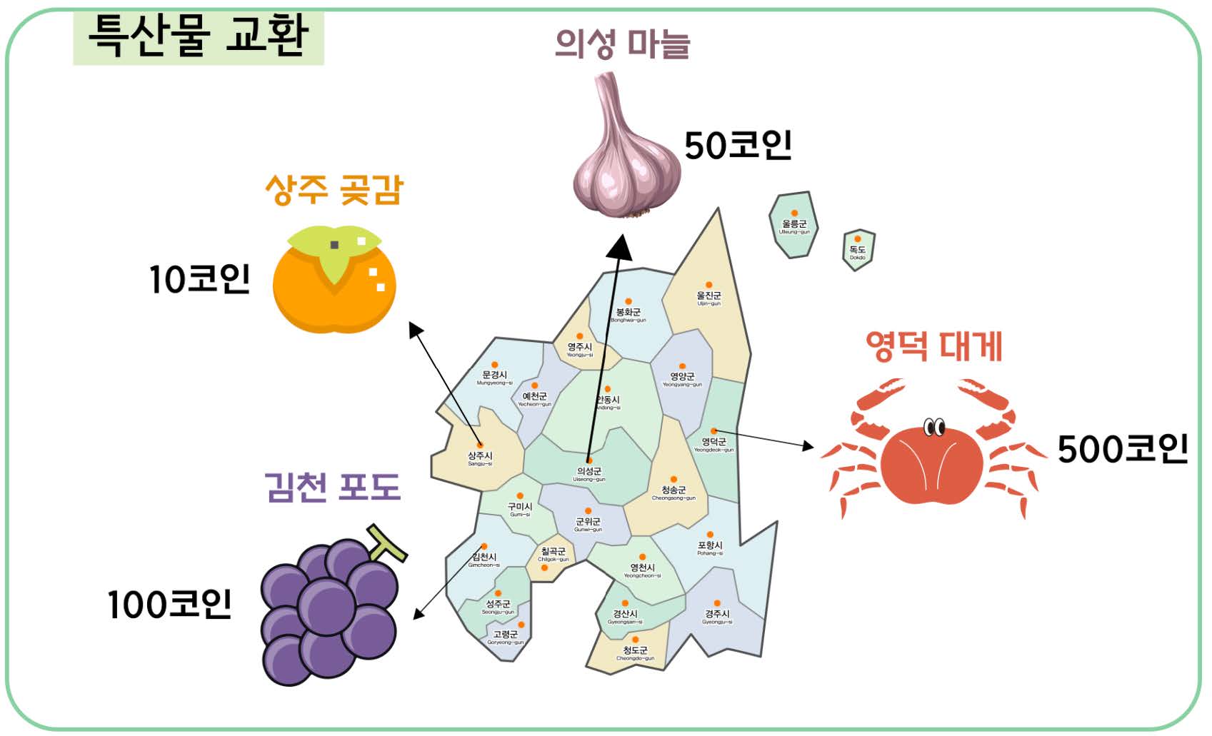 사용하고 남은 코인만큼 다음의 특산물들로 바꿔갈 수 있지만, 현금으로 돌려 받을 수는 없다.